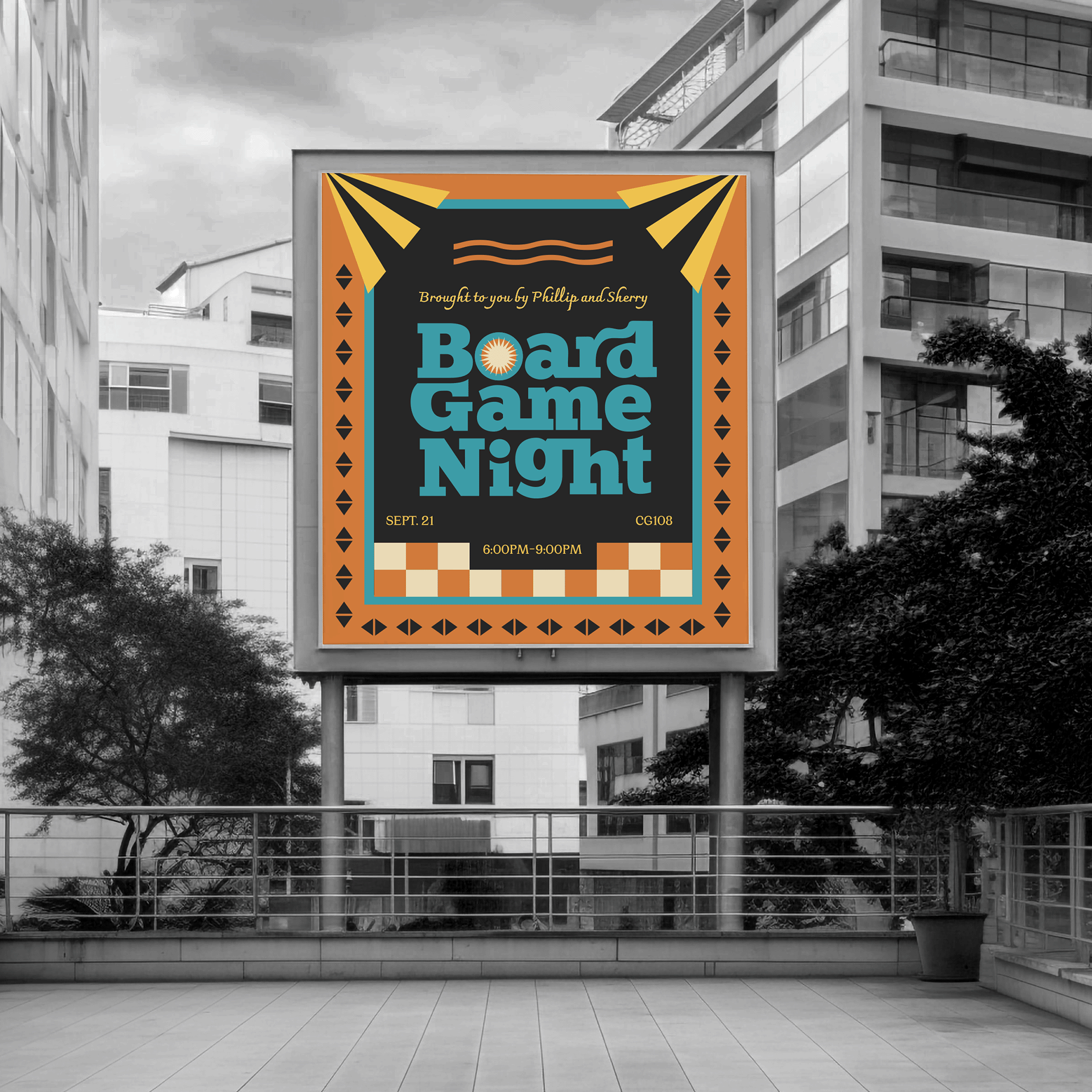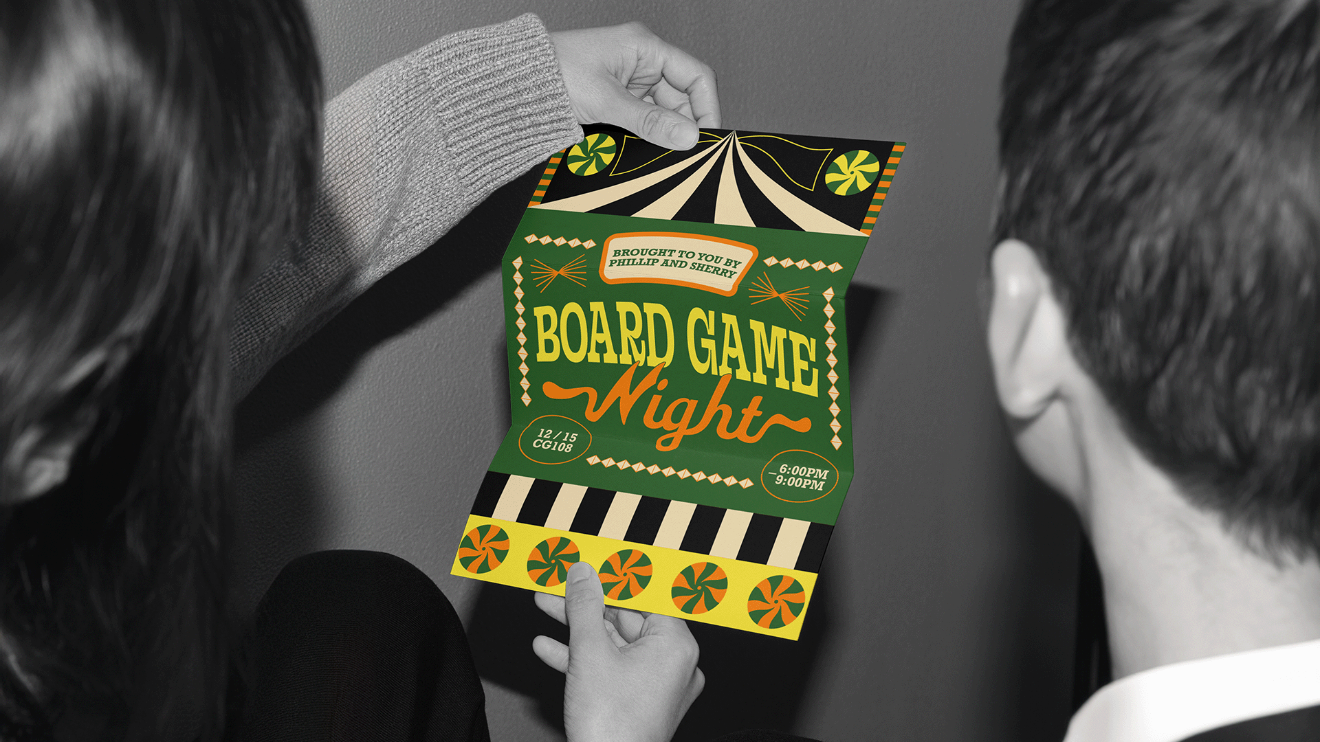 To promote the event with a lighthearted mood in the fall and winter, I utilized a carnival-inspired theme with a vibrant, saturated color palette and incorporated wore board game patterns to create an upbeat, cheerful vibe in the poster.