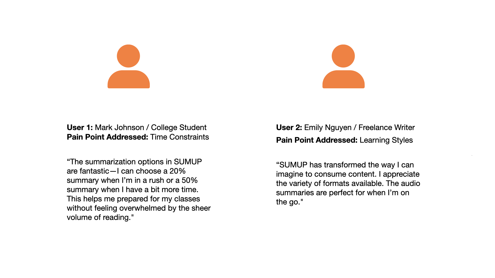 Sumup, empowered by AI, is an mobile application designed to assist individuals in quickly digesting information from long-form readings in academic, professional, or personal settings. By expediting the process of sifting through lengthy texts, Sumup enables quicker access to overarching ideas.